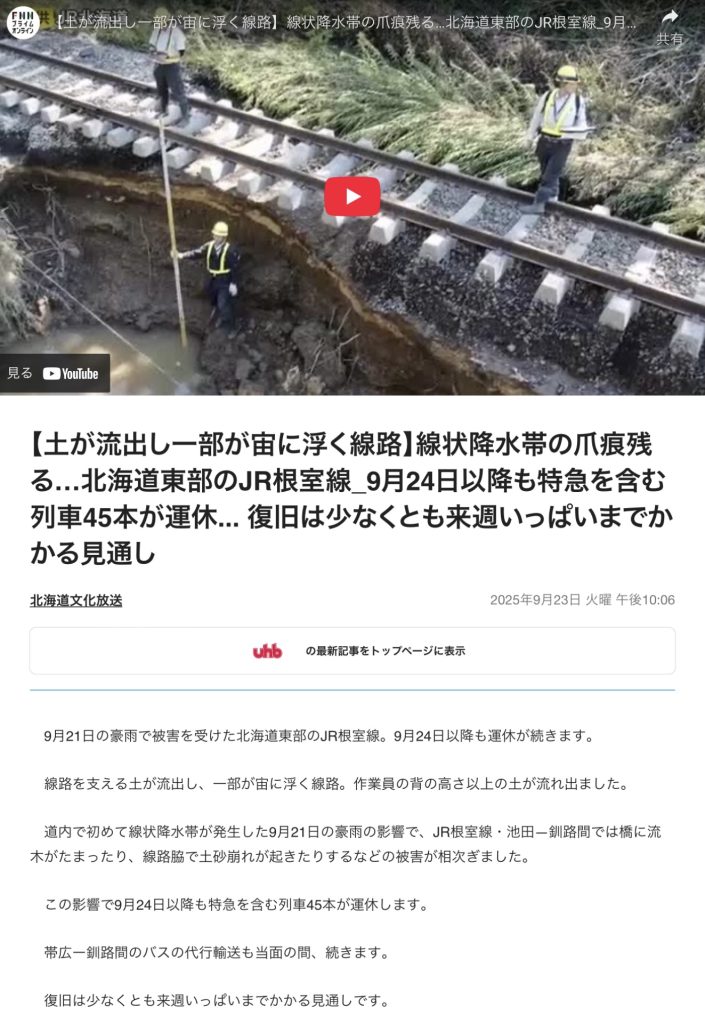 【土が流出し一部が宙に浮く線路】線状降水帯の爪痕残る…北海道東部のJR根室線_9月24日以降も特急を含む列車45本が運休… 復旧は少なくとも来週いっぱいまでかかる見通し