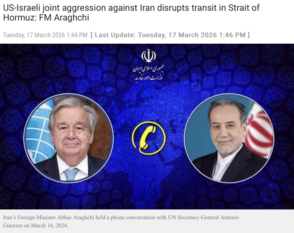 アラグチ氏は月曜夜、アントニオ・グテーレス国連事務総長との電話会談で上記の発言を行い、米国とイスラエルによる国際法の露骨な違反を強く非難する責任が国連にあることを改めて強調した。