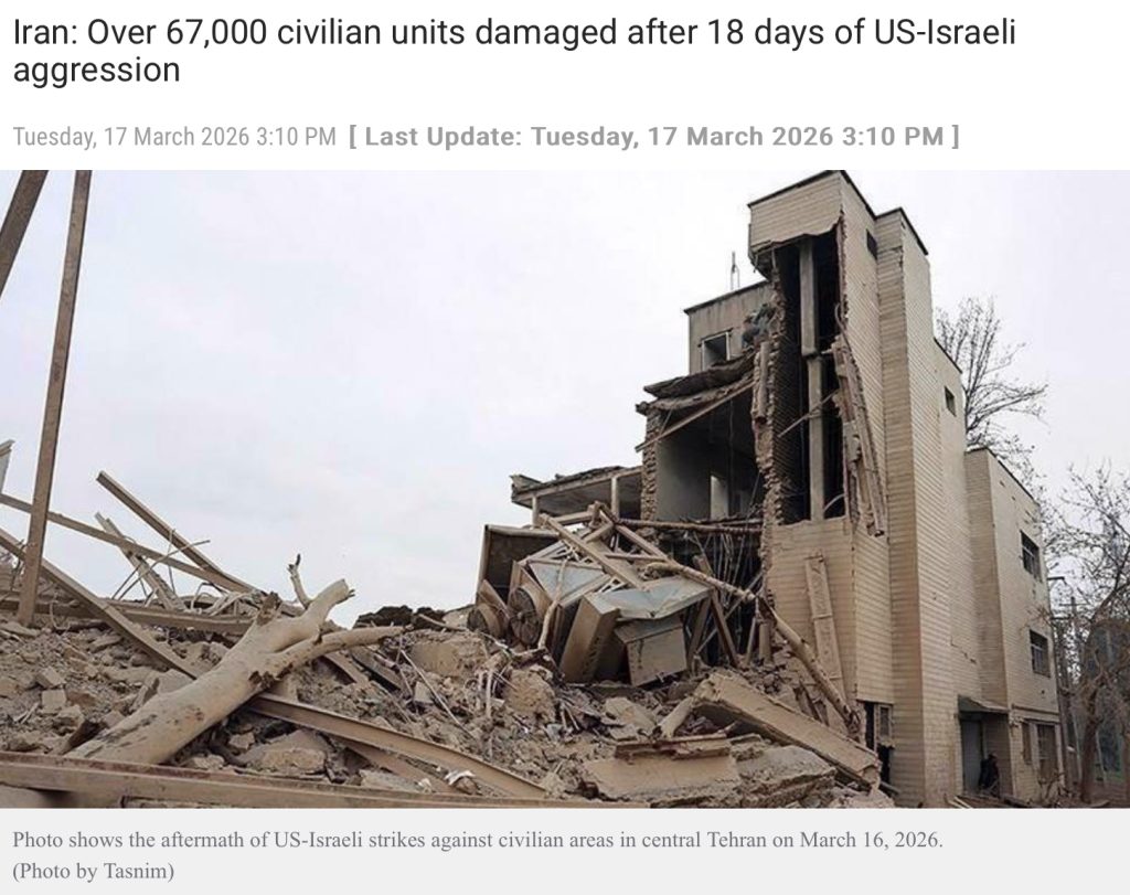 Iran: Over 67,000 civilian units damaged after 18 days of US-Israeli aggression