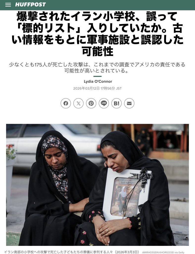 記事によると、イランのミナブにある小学校は、トマホークミサイルで爆撃され、少なくとも175人が犠牲になったと。ほとんどが子どもで、小学校は「工場として特定され、標的として承認されていた」とあります。
